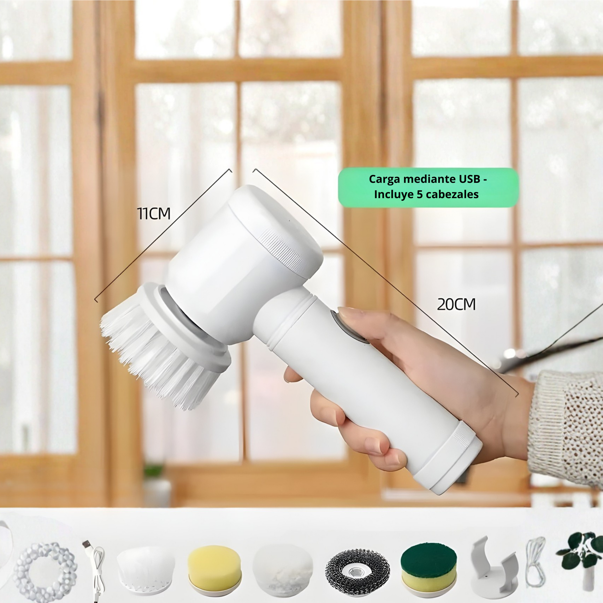 Recibirás el cepillo eléctrico, el cable de carga y los 5 cabezales específicos para cada rincón de tu casa y el manual de instrucciones.